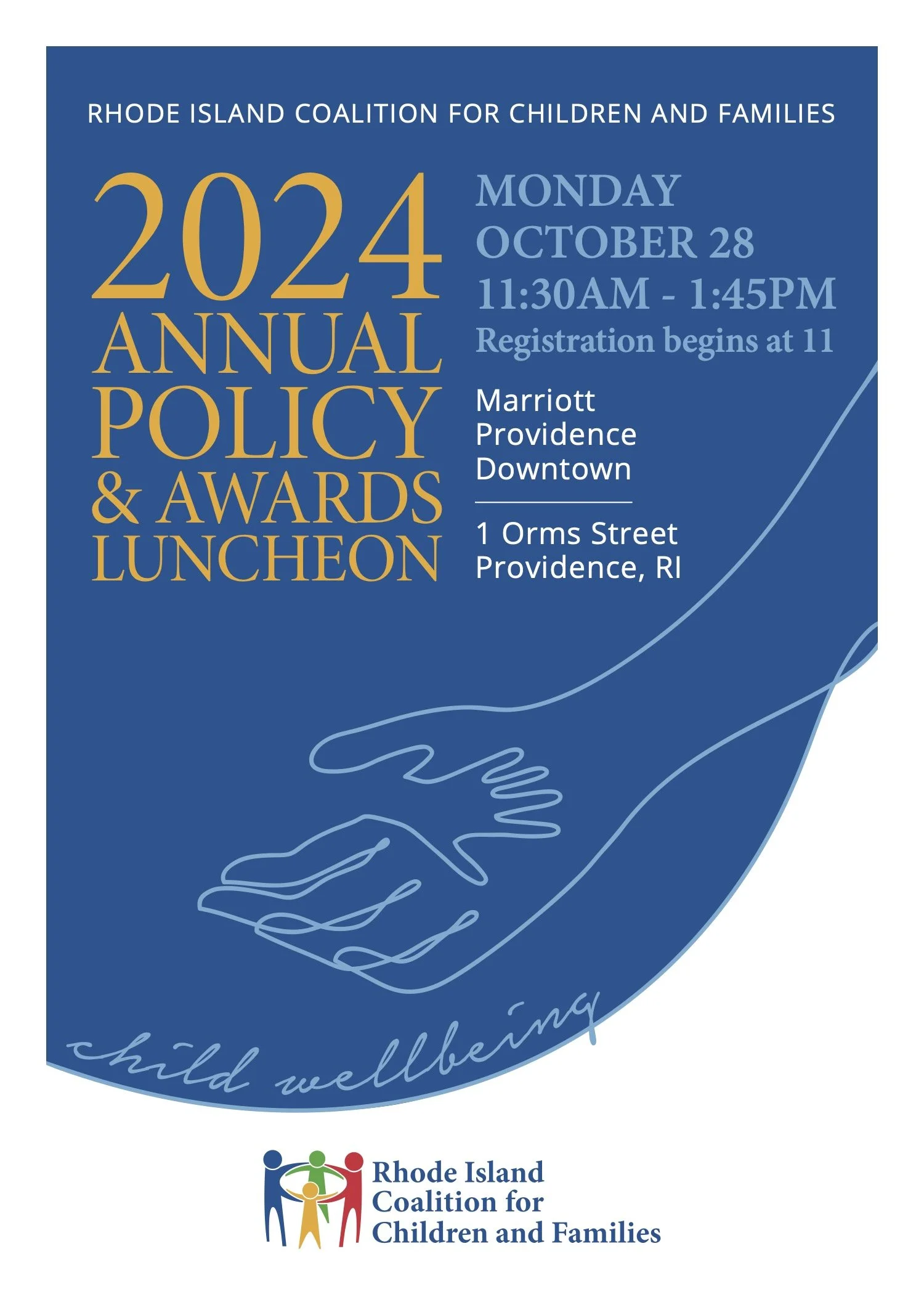 The Rhode Island Coalition for Children and Families is thrilled to bring together community human service and health providers with corporate, government, and philanthropic leaders at our 2023 Policy and Awards Luncheon. First initiated in 2018 and suspended during the COVID-19 epidemic, our event celebrates the work of our sector in promoting the safety, health, and success of children, youth, and families. This year’s luncheon will be an opportunity to hear from a dynamic leader in our field, honor elected leaders and lift up particular legislative actions and recognize the contributions of public sector and community champions.