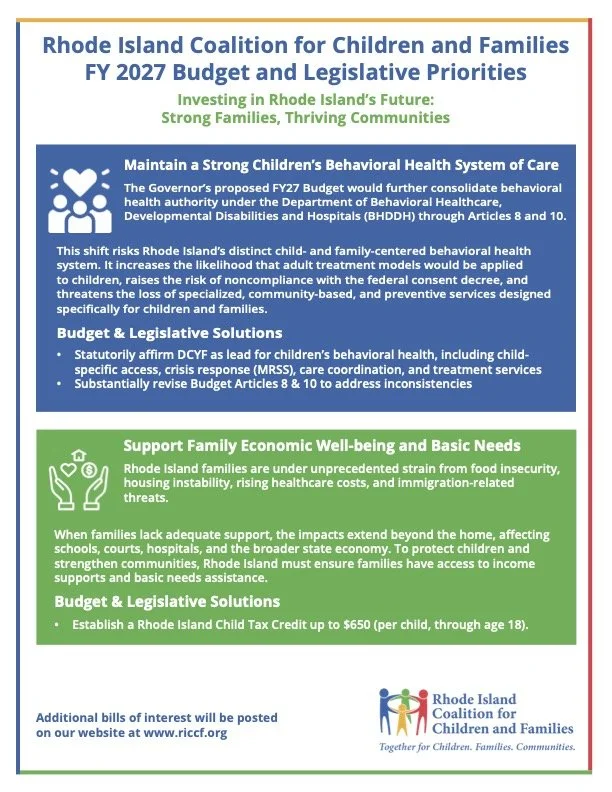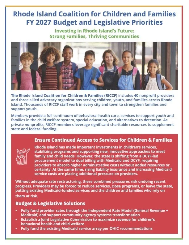 The Rhode Island Coalition for Children and Families (RICCF) held its FY2027 Budget and Legislative Priorities Briefing at the Rhode Island State House on Tuesday, February 10. The briefing brought together legislative leaders, service providers, and advocates to highlight policy and budget actions needed to ensure children and families across Rhode Island continue to have access to essential supports, create a strong children’s behavioral health system of care, and support families’ economic well-being and basic needs.